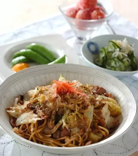 焼きそばはだし汁を加えてほぐしながら炒めましょう! 食後はプチトマトをデザートに!