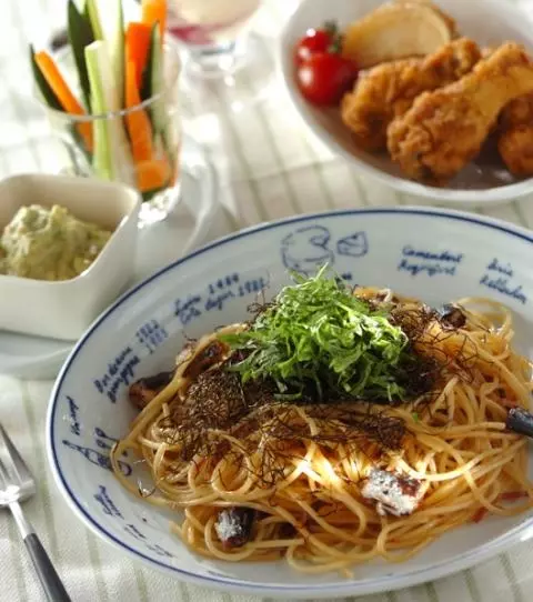 今日の献立は「オイルサーディンの和風パスタ」を含めた全4品。