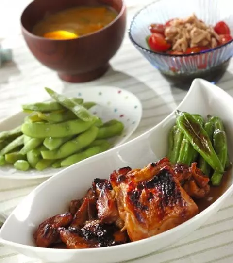 照り焼きチキンはハチミツを使うのがポイント。枝豆は両端を切る事で、おいしさ倍増!