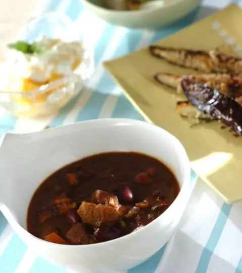 玉ネギ、ニンジン、セロリ、ピーマンなど野菜たっぷり! キドニービーンズがポイント。