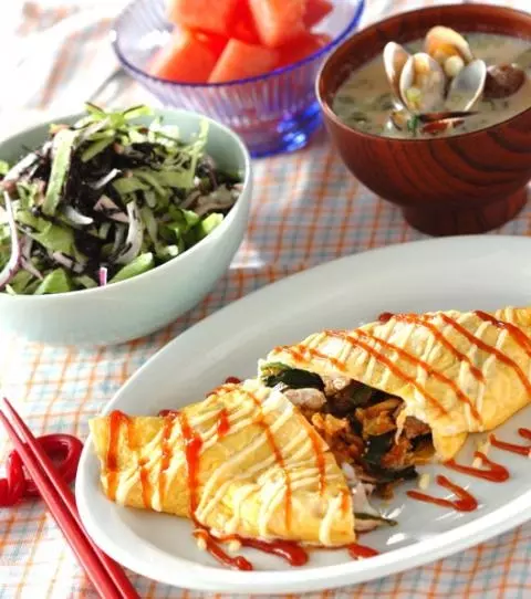 豚キムチがオムレツに! マイルドな味わいでお子様にも人気のメニュー。