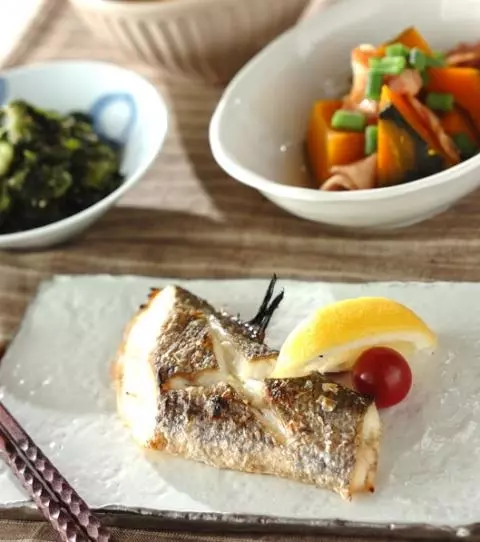 スズキはシンプルに塩焼きに。カボチャの甘煮はベーコンを加えてコクをプラス!