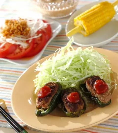 定番のピーマンの肉詰め。蒸すことでふわっとした食感に!