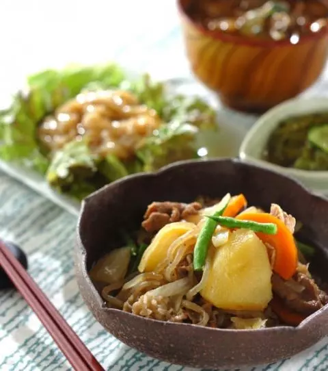 和食の基本! 肉ジャガをマスターしましょう。ワサビの効いたイカは箸休めにピッタリ!