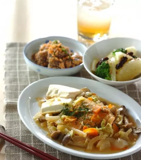 今日の献立は「鮭と野菜のみそ蒸し煮」を含めた全4品。