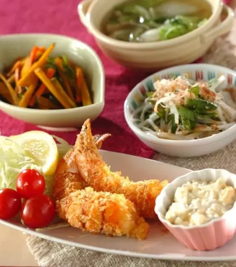 エビフライは特大サイズで作るのがおすすめ! タルタルソースはカッテージチーズが隠し味。大根サラダは練りからしを効かせて。