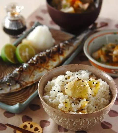 栗、サンマ、小芋など秋の食材を使ったメニューがたくさん! 栗ご飯はもち米入りでモチモチですよ。