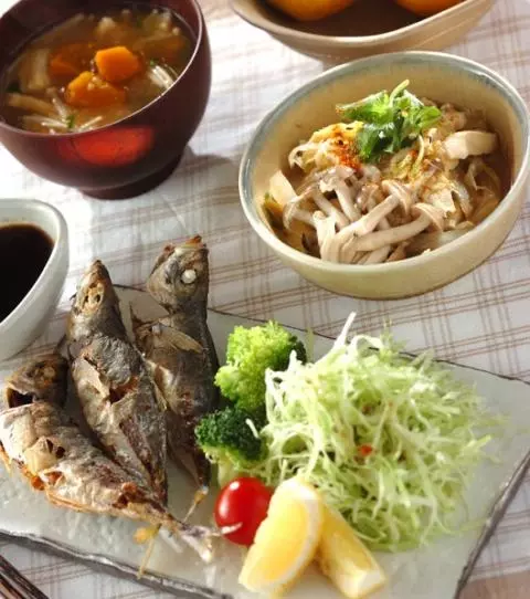 骨まで食べられる小アジのから揚げは、揚げる温度がポイントに。みそ汁はカボチャの甘みが広がります。