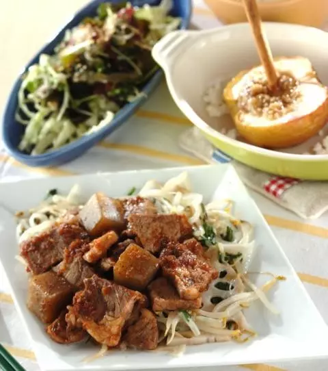 今日の献立は「牛肉とコンニャクのサイコロステーキ」