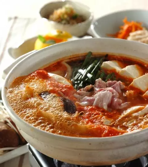 みそを入れたキムチ鍋はコクがあって美味! みんなでワイワイパーティーにもピッタリ。箸休めにナムルとジャコおろしが合います。