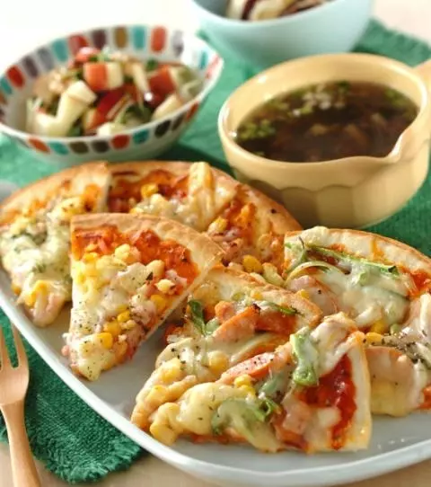 市販のピザクラストとソースに好きな具材をトッピング。子供が好きな甘い味と大人好みのピリッと辛い味の2種を楽しみましょう!