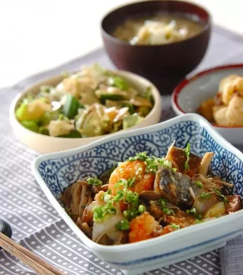 しっかりと下味をつけたサバとエビをカリッと揚げて、野菜たっぷりなだし汁に浸ける豪華な一品。