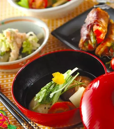 今日のお雑煮はおすまし仕立て。煮詰めすぎないのがポイントです。野菜を巻いた豚肉ロールは彩りきれいです。