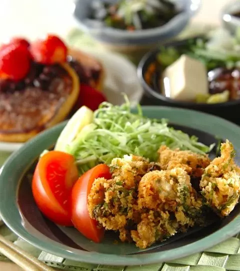 カキに香り高い大葉入り衣をつけて、サクッと揚げましょう。手作りタルタルソースとの相性はバッチリ! だしの効いた湯豆腐は、お好みの薬味で召し上がれ。