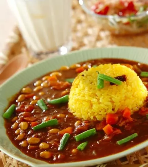 大豆を入れた野菜たくさんのカレーは栄養満点! 肉の代わりにベーコンの厚切りを使っていつもと少し違う風味のカレーを楽しんでください。みずみずしい大根サラダと一緒に。