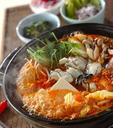 スタミナ満点のカキ入りキムチ鍋のしめは中華麺で! ホウレン草のナムルは箸休めにピッタリ。デザートはイチゴミルクカンでサッパリと。