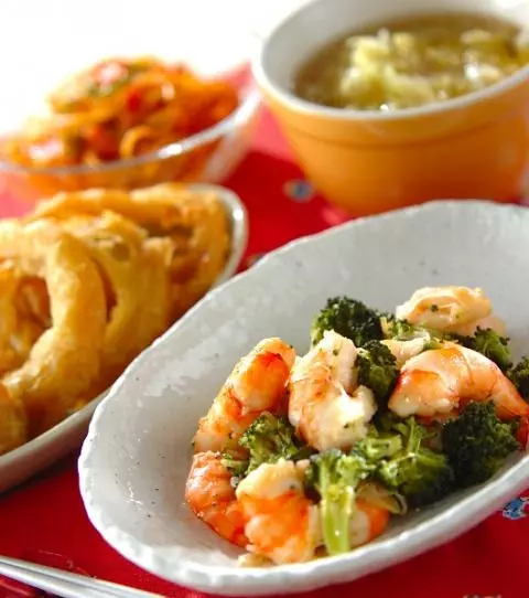 今日の献立は「エビとブロッコリーの塩炒め」を含めた全4品。
