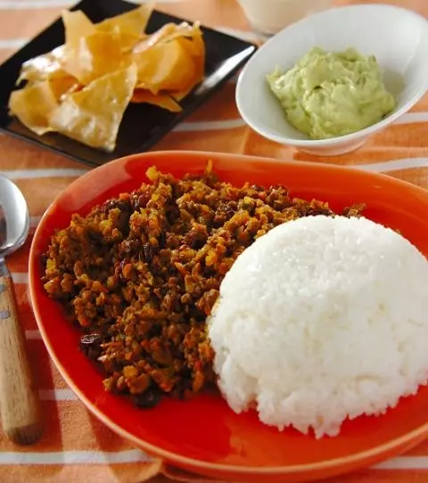 フライパンで簡単にできる本格ドライカレー。春巻きの皮を揚げてアボカドディップにつけて食べると美味! ラッシーはカレーの後にサッパリしますよ。