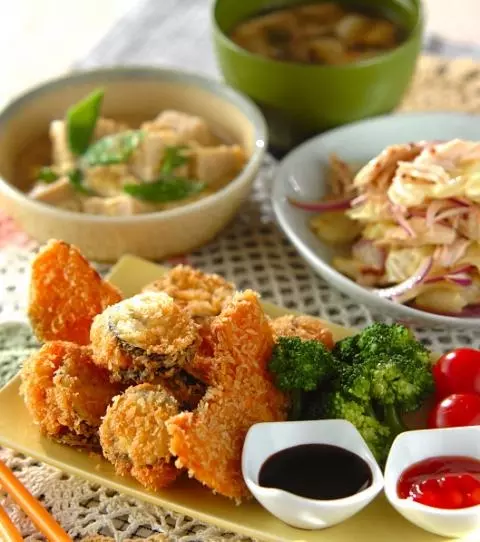 今日の献立は「ナスのエビはさみ揚げ」を含めた全4品。