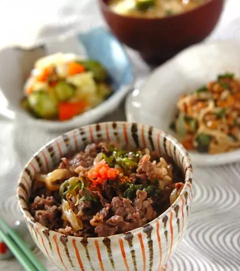 がっつりイメージの牛丼をサッパリとやさしい味に仕上げました。まだ少し肌寒い季節に、身体が温まるトロトロかき玉汁と一緒に。