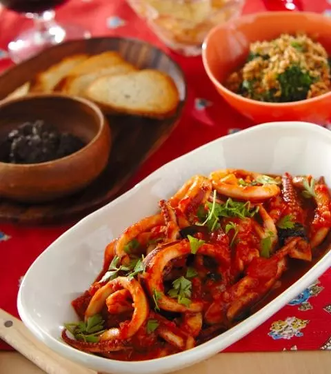 赤ワインにピッタリなメニューは、イカをトマトソースで炒めたバジルの香り広がる一品です。
