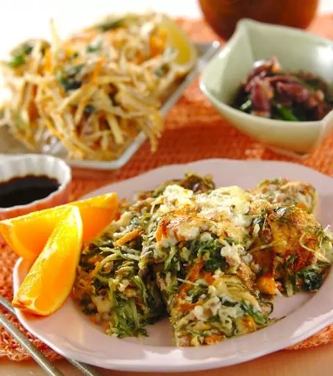 野菜もお肉も摂れる卵焼きは、柑橘汁のきいたタレでアッサリと食べられます。野菜のかき揚げや納豆の汁物など、栄養たっぷりのメニューです。