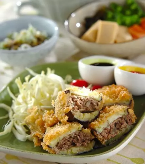 ナスにひき肉をはさんでボリュームUP! ナスがジューシーでおいしいです。