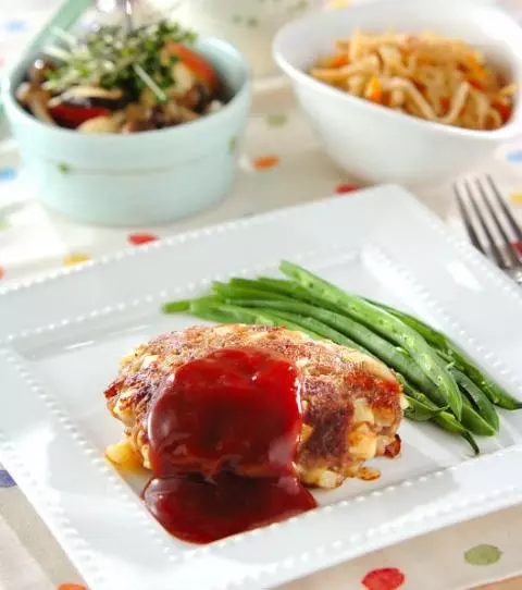 定番ハンバーグにポテトとチーズがゴロゴロ。子供が喜ぶメニューです。