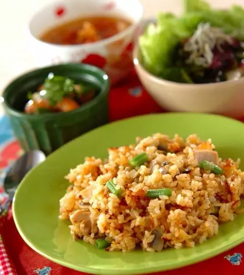 炊飯器で作るピラフは、お米にしっかり味が入って美味。お米のかたさもちょうど良くなります。