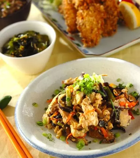 豆腐と数種類の野菜を一緒に炒り、最後にふんわり卵をからめてでき上がり。やさしい家庭の味です。