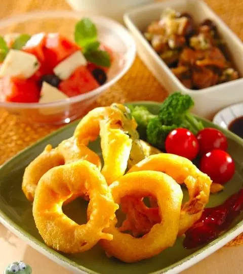サクッと揚げた玉ネギはカレー味でおつまみにも最適。スイカはそのまま食べるのもおいしいですが、サラダとしてもGOOD。