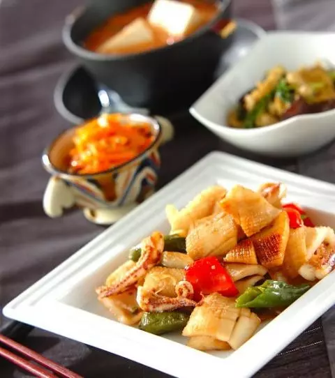 山椒の香りが効いたイカの照り焼きは、野菜をたっぷり入れてサッと炒めましょう。ニンジンを丸ごと1本使った甘酢和えはクルミを入れて洋風に。