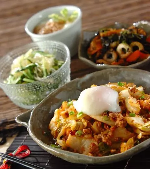 今日の献立は「キャベツの肉みそキムチ炒め」を含めた全4品。