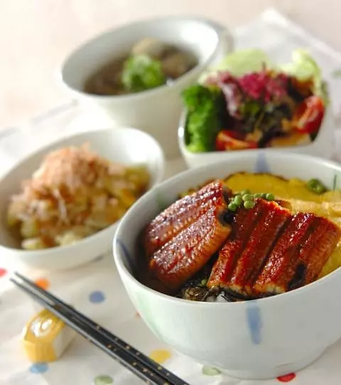 今日の献立は「卵焼きのせウナ丼」を含めた全4品。