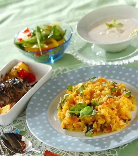 今日の献立は「カボチャとベーコンのリゾット」を含めた全4品。