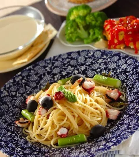 今日の献立は「タコとアスパラのパスタ」を含めた全4品。