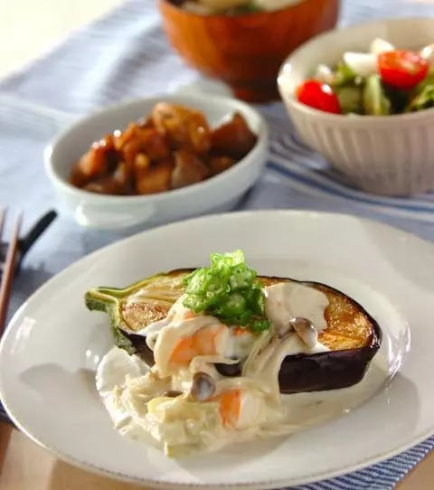柔らかい米ナスにクリーミーなエビソースをかけて。