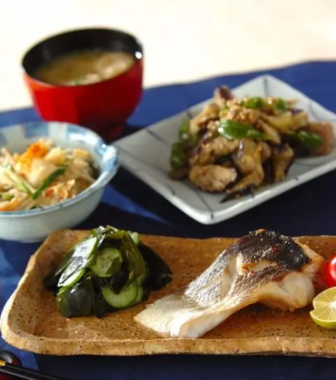 今日の献立は「スズキの塩焼き・酢の物添え」