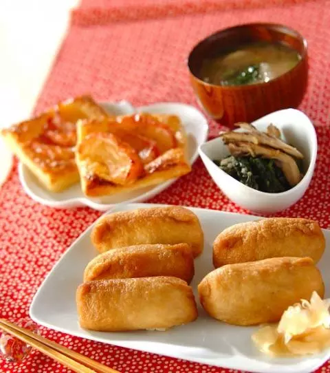 いなり寿司は秋の行楽弁当にもピッタリ。デザートはのっけるだけのアップルパイ。