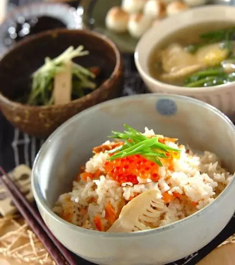 今日の献立は「イクラのせ塩鮭の炊き込みご飯」