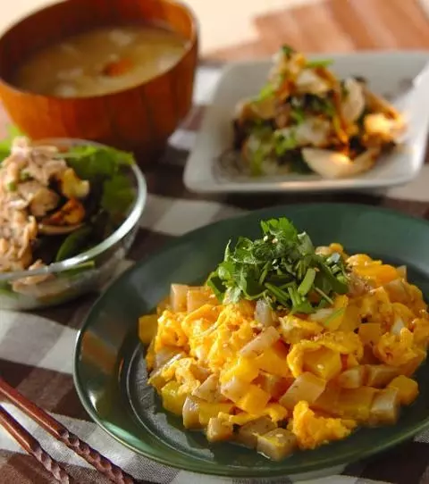 野菜をたっぷり使った献立です。メインはパパッとできる卵焼き!
