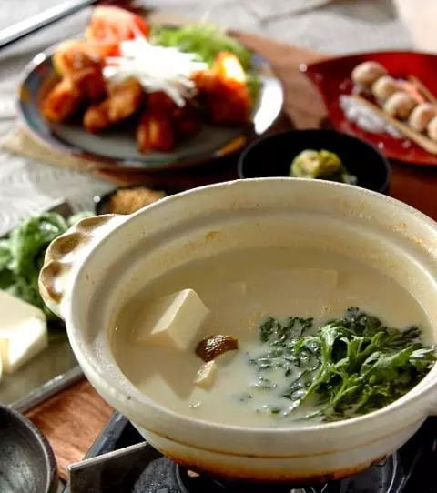 豆腐を崩しながら召し上がれ! 春菊の苦みと豆乳の優しい甘みがよく合います。