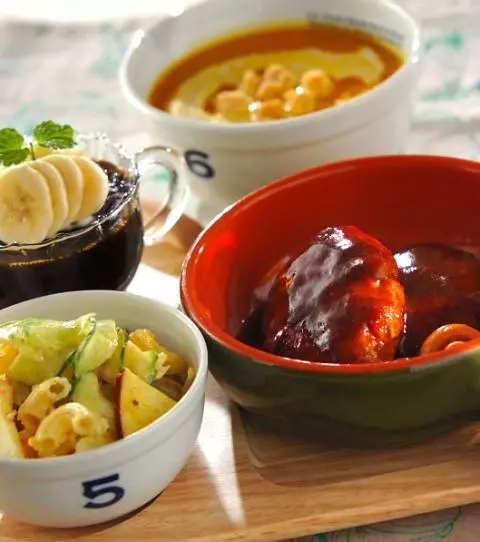 今日の献立は「蒸し焼きハンバーグ」を含めた全4品。