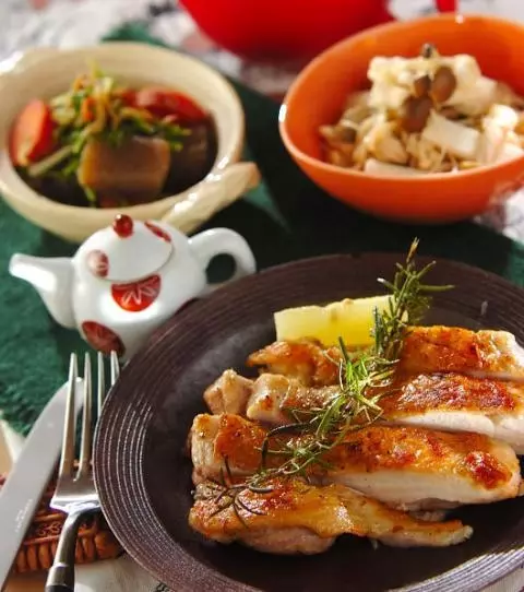 皮をパリッと焼いた鶏肉に、ほっとする優しい味がおいしい副菜を添えて。