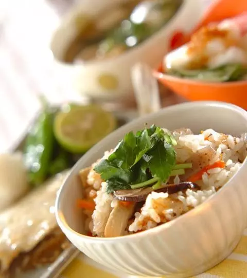 旨味たっぷり炊き込みご飯に、カリッと香ばしいカレイの唐揚げを添えて。