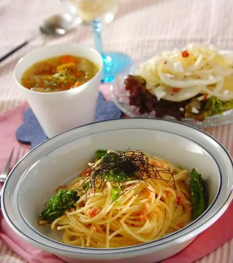 菜の花のグリーン色が鮮やかなガーリックパスタ。