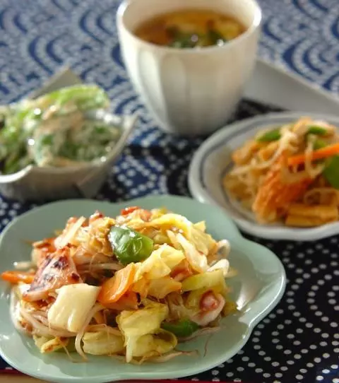 今日の献立は「イカのソース炒め」を含めた全4品。