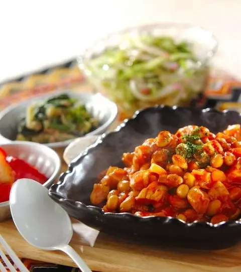 今日の献立は「たっぷりチリコンカン」を含めた全4品。