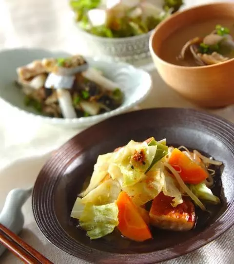 今日の献立は「キャベツと揚げ天の煮物」を含めた全4品。