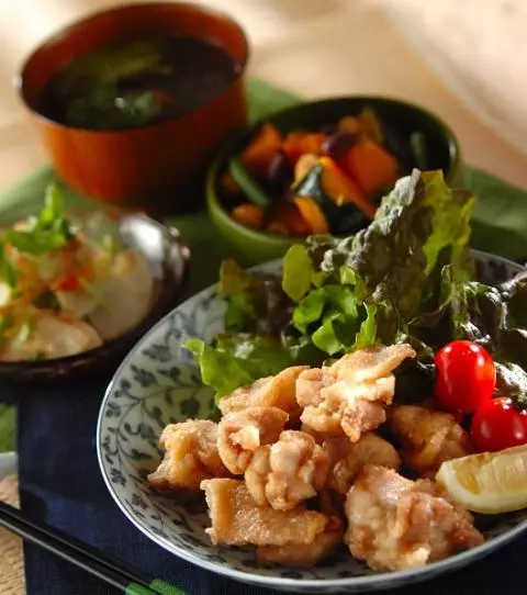 鶏の唐揚げに酢の物、煮物……基本を大切にした和献立です。